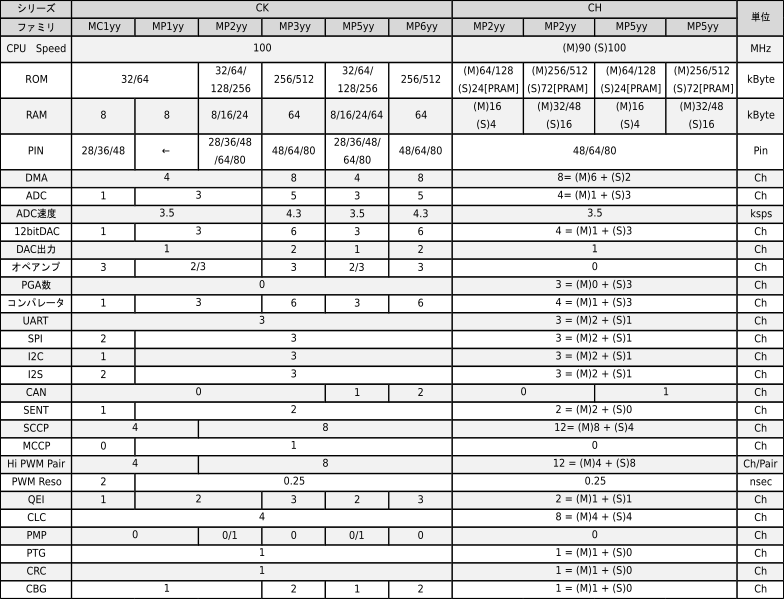 dsPIC33シリーズの諸元表