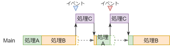 割り込み処理はこうした場合に、「何かのイベントが発生した時」に「別の処理Cを先に実行」し、その実行が終われば元のソフトの実行を継続する仕組みです。