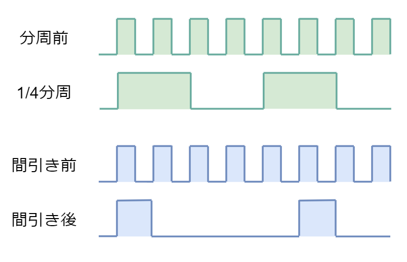 DIV_NUM = 0.5 * DIV_DUTYの場合には一般的な分周回路になり、それ以外の場合は間引き回路になります。