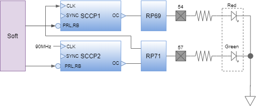 今回はSCCP1,SCCP2をPWMモードとして構成します。まずSCCP2を分周元のクロックを生成しRP71ピンを経由しPWM出力させます。そしてそのクロックをリマッパブルピンのRP71ピン経由でSCCP1のクロックとして構成させます。