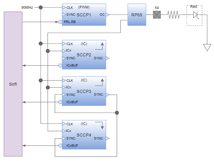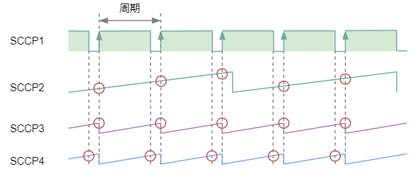 今回はダミーとしてSCCP1をPWM出力させ、その信号を他のSCCPモジュールでインプットキャプチャ動作させます。通常のインプットキャプチャの動作ですと、(fig.1)のSCCP2の様にエッジイベントごとにフリーランタイマ値を取得することになります。この時に周期を得る為には、今回の値と前回の値の差分をCPUで演算する必要が発生します。またオーバーフロー処理(0xFFFFを跨いだ場合)は更に面倒です。