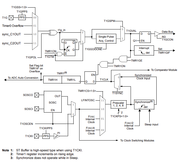 Timer1,3,5モジュールはゲート機能付き16bitタイマで、タイマがON(T1CONbits.ON =1),ゲート機能が有効(T1GCONbits.GE = 1)かつT1GVALがHighの時にカウントを行います。タイマがON(T1CONbits.ON =1),ゲート機能が無効(T1GCONbits.GE = 0)の場合は、常時カウントを行います。