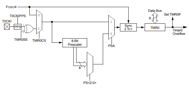 Timer0は下記のようにシンプルな8bitフリーランニングタイマです。FOSC/4か外部入力のクロックをプリスケーラで分周し、そのクロックでTMR0がカウントされます。