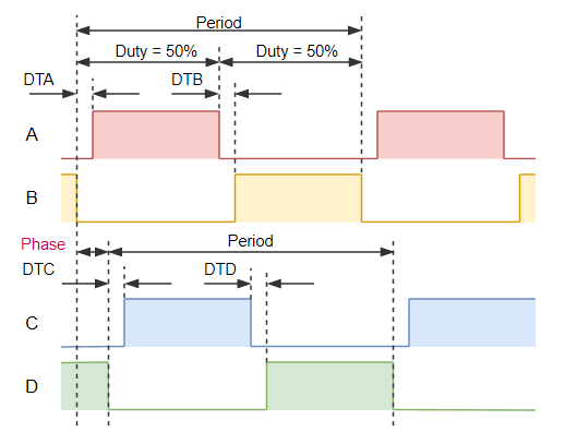 ・上下(AとB,CとD)アームは貫通電流が起こらないようにデッドタイム(DTA,DTB,DTC,DTD)を設ける