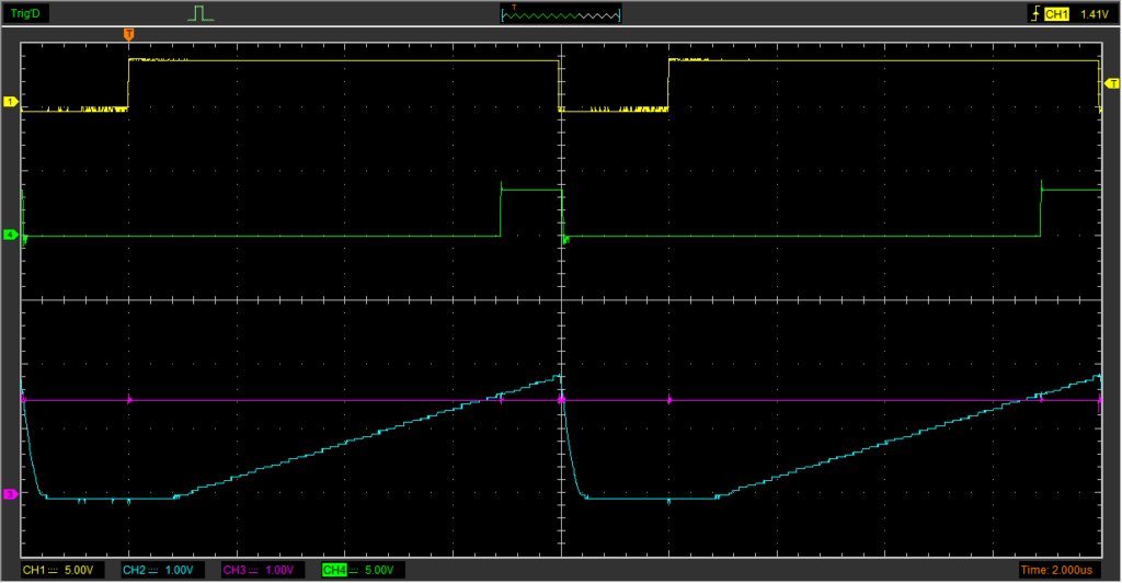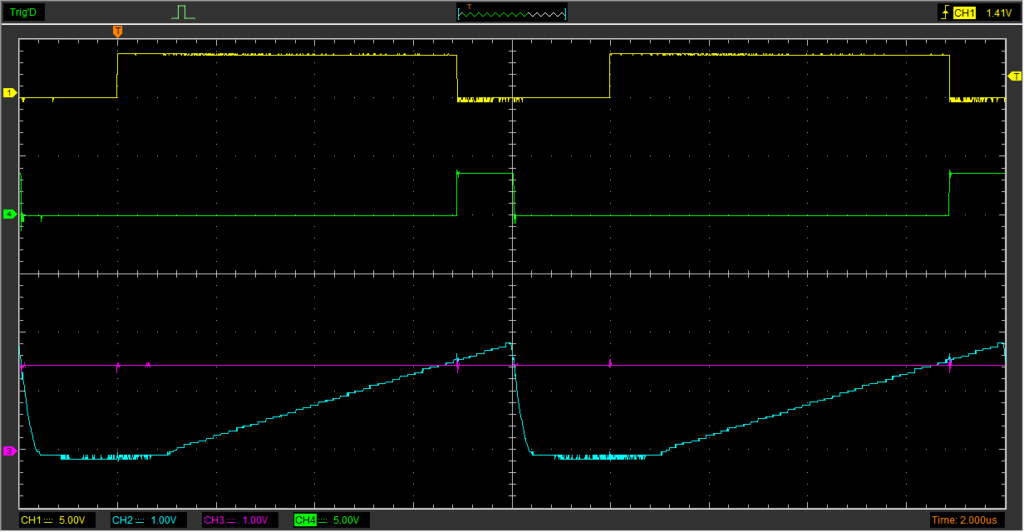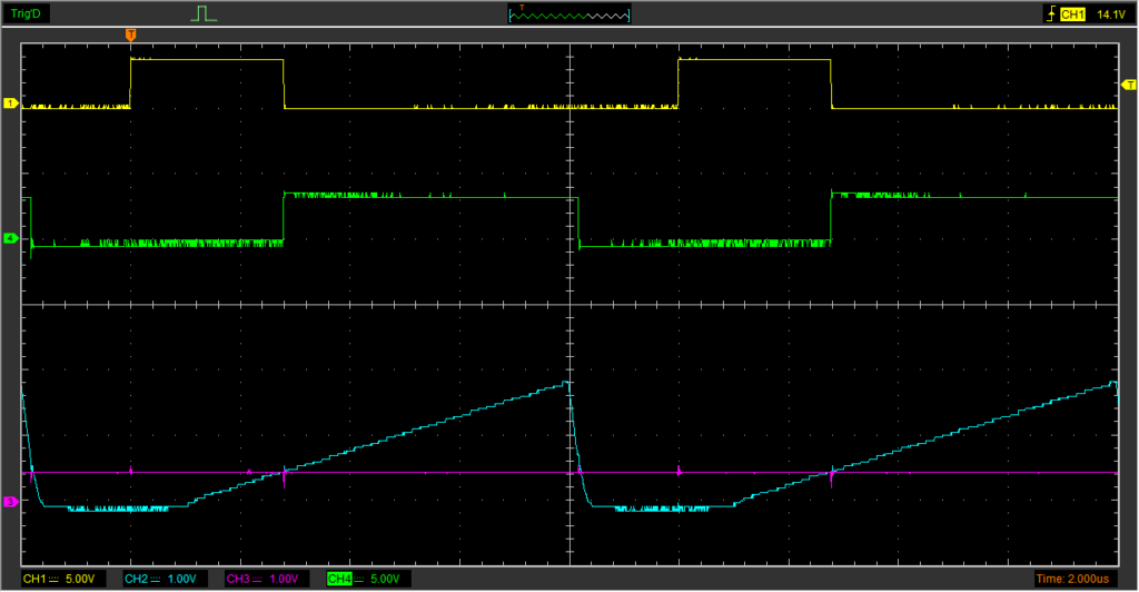 スロープ(Ch2/水色)電圧がポテンション電圧(Ch3/マゼンタ)を超えたタイミングでコンパレータの出力(Ch4/緑)が変化しています。この時PWMに変化は有りません。