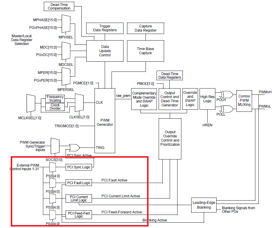 PCIとはPWM Control Inputの頭文字を取った略語で、主にPCIブロックに入力された信号を条件付けしPWM出力信号をトリガ、ゲート、オーバーライドするために使われます。