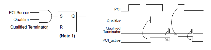 「PCIクオリファイアがアクティブ」かつ「PCI入力がアクティブ」で、PCIアクティブ信号がアサートされ、「クオリファイドターミネータが入力」されるまでラッチされる。
