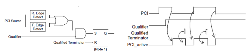 「PCIクオリファイアがアクティブ」かつ「PCI入力の両エッジ」で、PCIアクティブ信号がアサートされ、「クオリファイドターミネータが入力」されるまでラッチされる。
