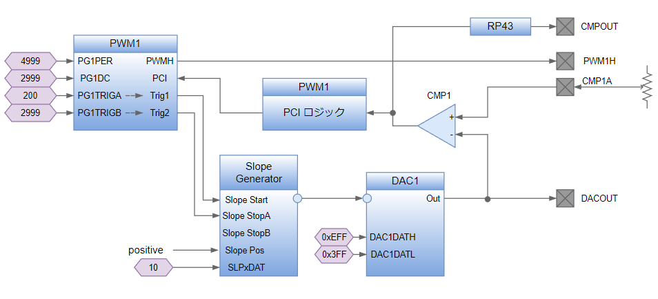 PWM1に同期したポジティブスロープとポテンションの電圧をCMP1で比較し、PCIソースとして利用します。