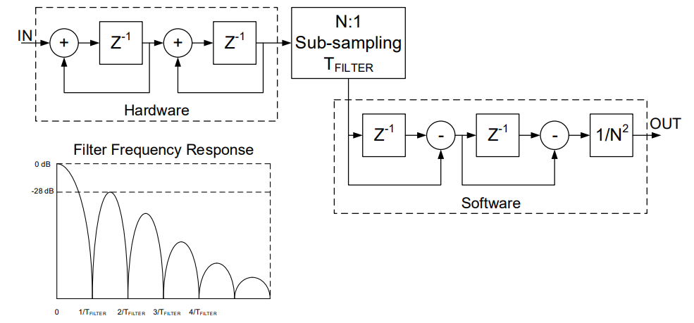 チャンネル17,18,19は2次CICフィルタモードを有しています。CICの一部の操作(微分機能)は、図15-3に示されているように、アプリケーションソフトウェアによって実行する必要があります。