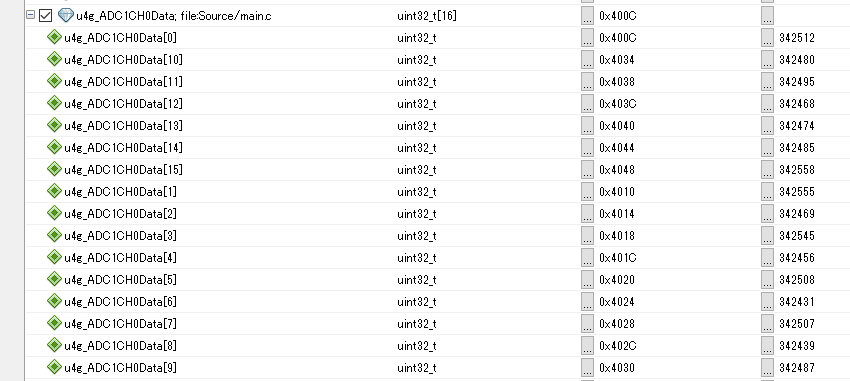 配列には、ポテンショメータの値が256倍オーバサンプリングされた16bitの結果が格納されていることが確認できます。