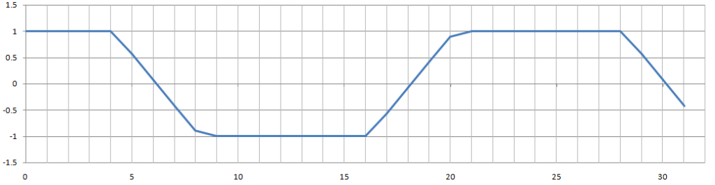 出力データが-1 ~ 1 で飽和してしまいました。これは積和演算の特性上、避けられない現象です。