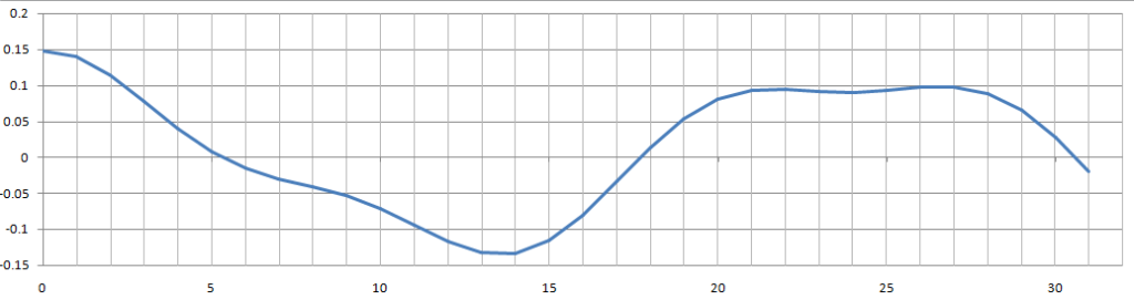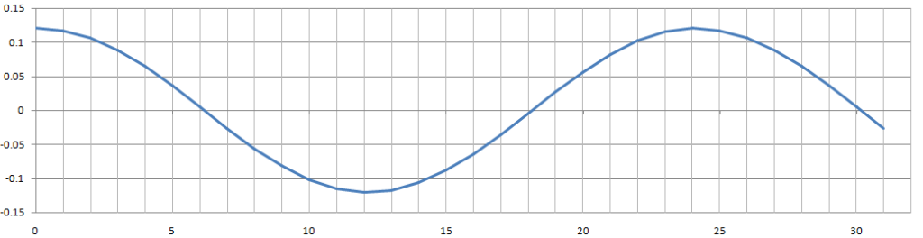 出力信号を要素順にプロットすると、24番目のデータが極大となっていることが確認できました。これは、2kHzの信号を48kHzでサンプリングしているため、48/2 = 24 サンプルで位相が1回転します。このように、自己相関アルゴリズムでは位相がそろったところで極大値を持ちます。