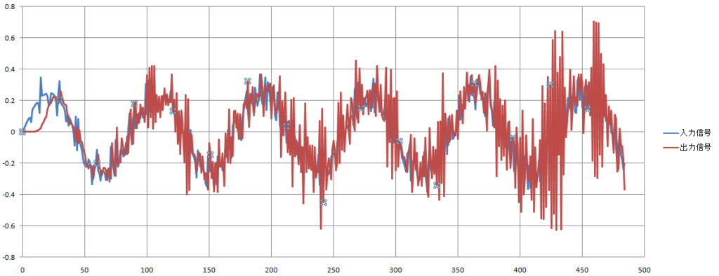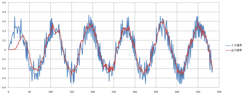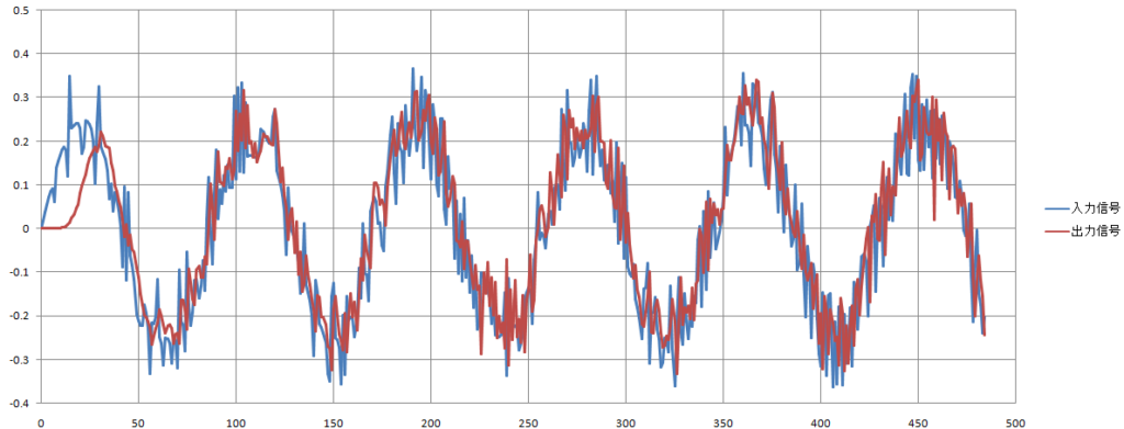 サンプリング周波数等を以下の値に設定した時の入力信号と出力信号を下記に示します。
