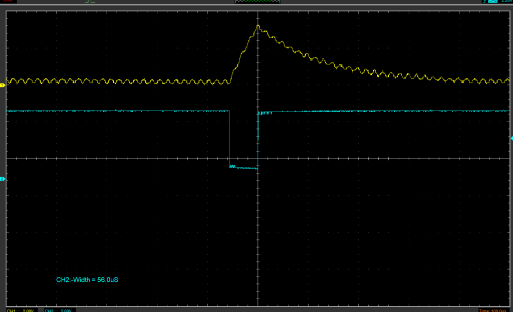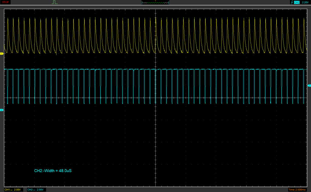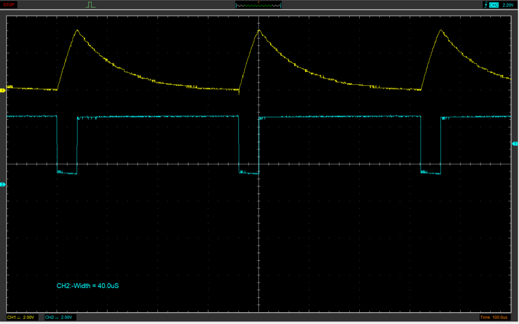 指のタッチが無い時は約40usecで充電しているのに対し、指をタッチすると約58μsecで充電している事が確認できました。ただし、タッチ無の場合は安定的な発振になるのに対し、タッチありの場合は充放電の時間が安定しない事も確認できました。