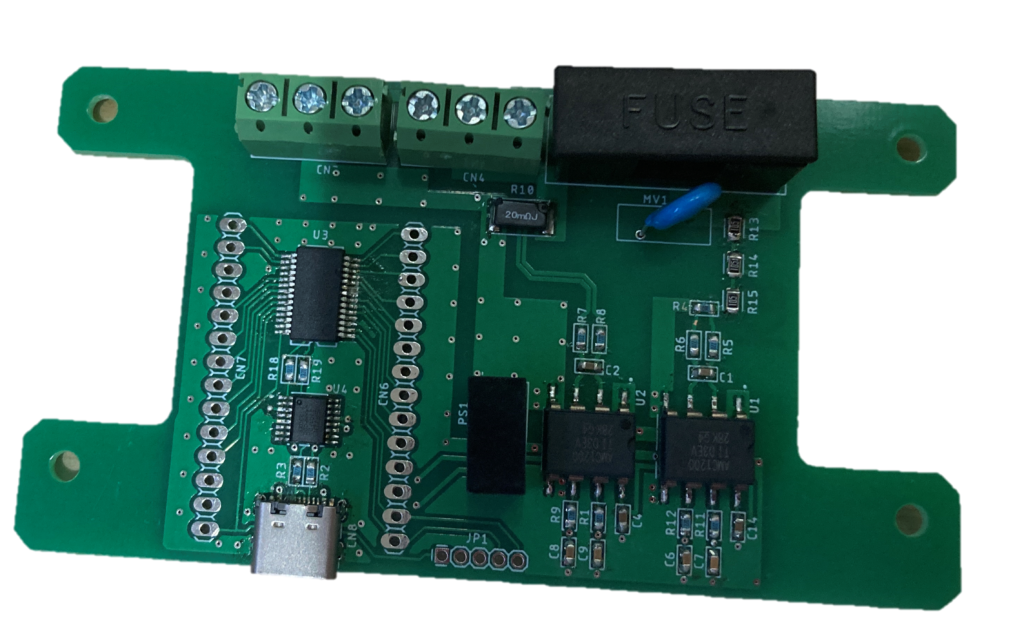 交流電圧・電流を絶縁して計測、各パラメータを演算しPCへ送信。PCにて結果を表示します。