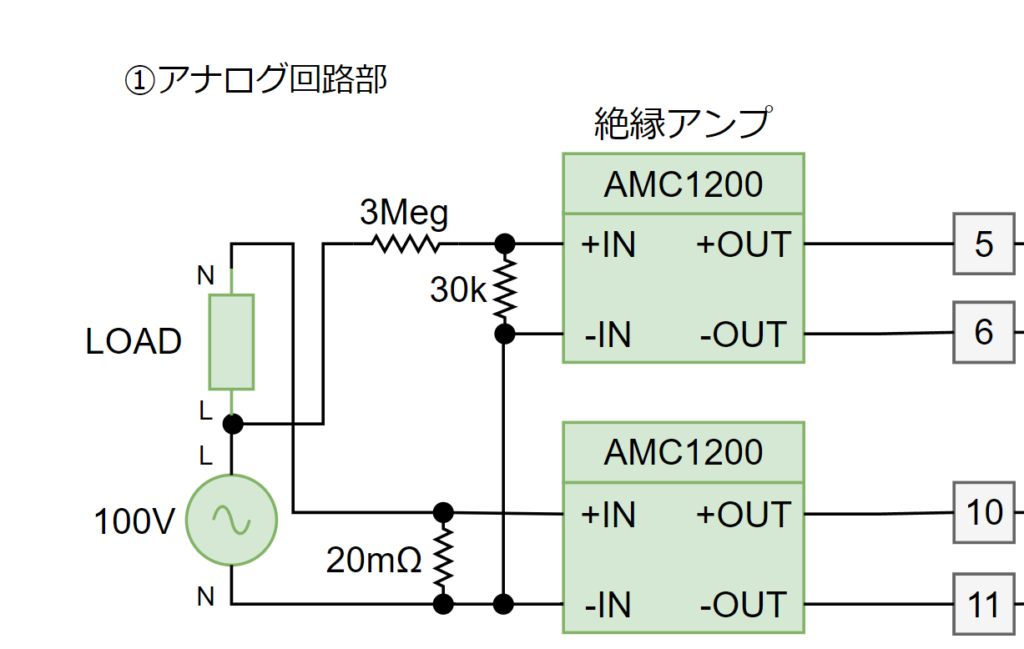 交流電圧は、抵抗分圧によってL(Live)側の電圧を1000分の1に分圧し、これを絶縁アンプに入力します。