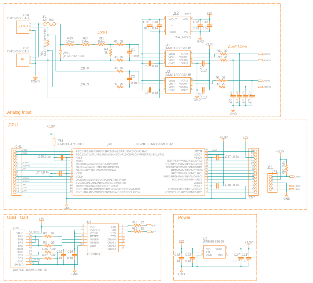 出力された差動信号は7.2kHzのローパスフィルターを通過し、マイコンのAD差動入力に接続されます。カットオフ周波数を7.2kHzに設定した理由は、商用電源周波数の高調波を40次程度までフラットに保ち、かつ位相の回転を極力抑えるためです。