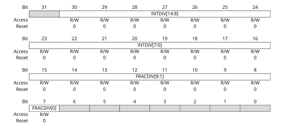 CLKGenのCLKxDIVレジスタは以下の通りINTDIV(15bit)とFRACDIV(9bit)部に分かれており、この機能により微細なクロック周波数が生成可能です。