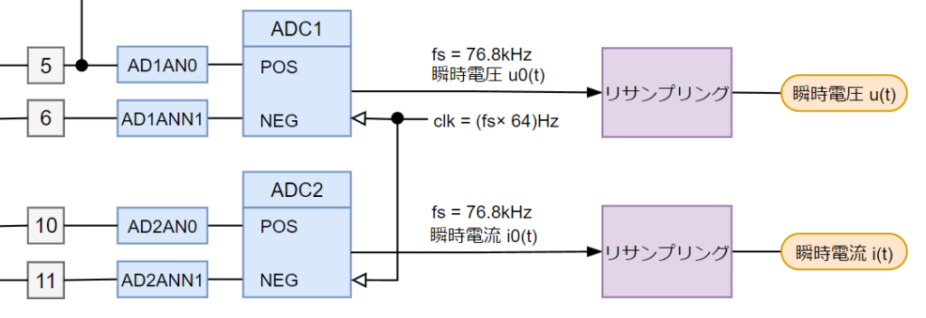 電圧は ADC1、電流は ADC2 を使ってシングルエンドモードで同時にサンプリングします。