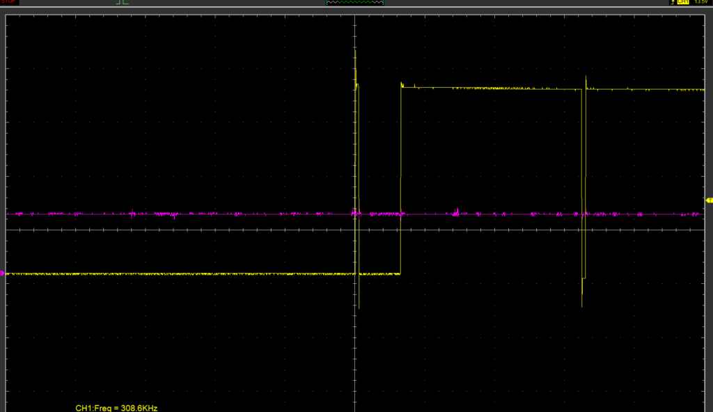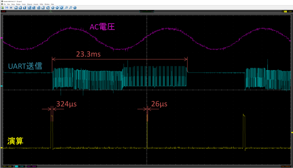 こちらは、平均化回数を2回に設定して動作させた際の波形です。ゼロクロスごとに演算が行われている様子が確認できます。具体的には、1回目のサンプリングでは演算に26μsec、2回目では324μsec、そしてその後のデータ送信には23.3msecを要しています。