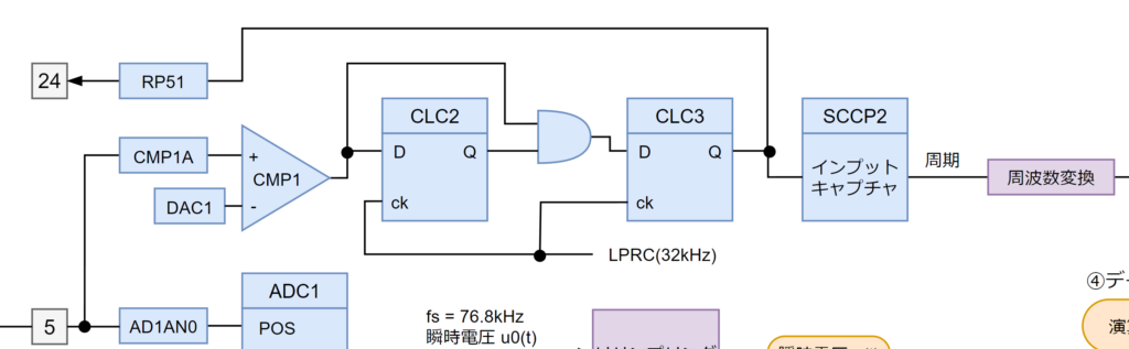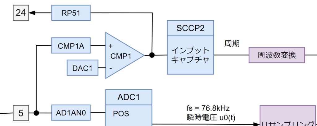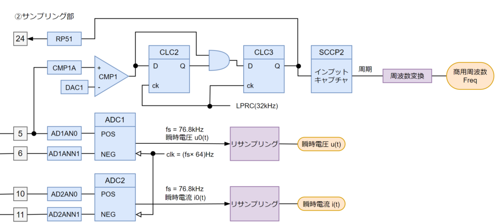 サンプリング周期(fs)はアンチエイリアシングフィルタのカットオフ周波数である7.2kHzより遥かに高い 4.9152 MHz とし、ADC内蔵の 64倍オーバーサンプリング により、fs1 = 76.8 kHz ごとに結果を出力させます。なぜこのような中途半端な値にしたかと言うと、1サイクル(50Hzまたは60Hz)あたりのサンプル数をリサンプリング処理により256回 としたかったためです。これにより、後続の処理が 2のn乗 になるため、計算が効率的に行えるようになります。