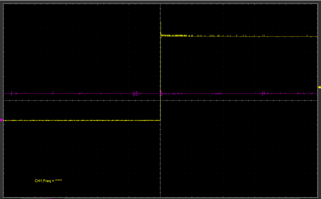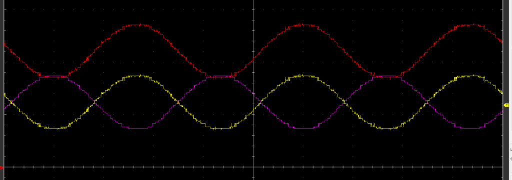 この信号をシングルエンドモードで正入力のみ計測すると、綺麗なサイン波が得られます。一方で、差動モードで測定し、符号処理を加えると、ゼロクロス付近でグリッジ(瞬間的な不連続)が発生していることがわかりました。