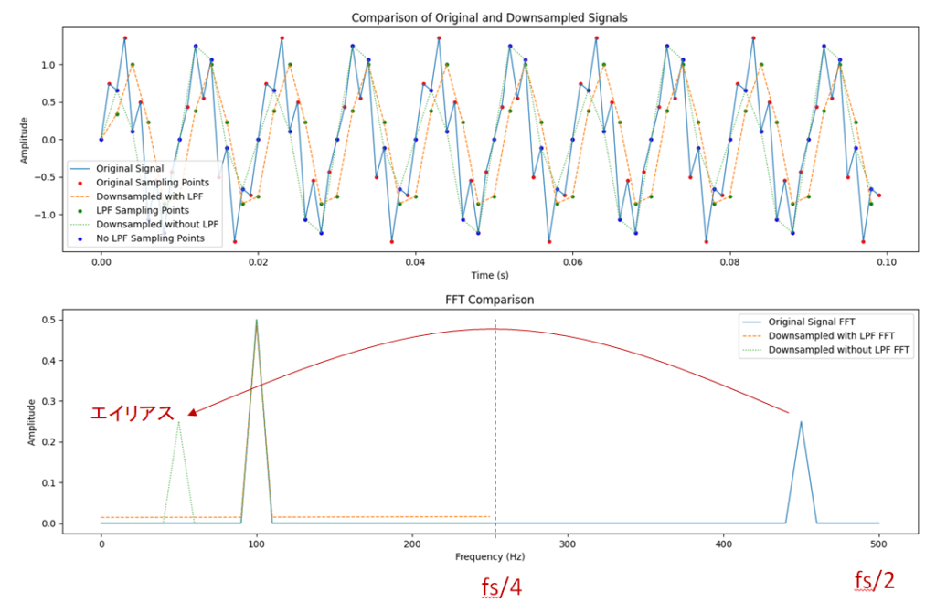 以下のグラフは、100Hzと450Hzの成分が含まれる信号を、サンプリング周波数 fs=1kHz で取得したデータです。この信号を250Hz(fs/4)のカットオフ周波数で帯域制限した後、間引き率2で間引いた場合と、帯域制限を行わずにそのまま間引いた場合の比較を示しています。