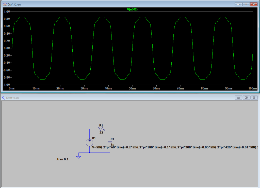 例として、60Hzの基本周波数に加えて 3次、5次、7次、9次 の高調波がそれぞれ 20%、10%、5%、1% の割合で重畳したとして、これらの波形をLTSpiceでシミュレーションすると以下のように表されます。