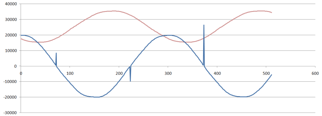 しかし、公開されていない別のエラッタが存在するかも知れません(*1)。というのも、正入力と負入力の符号が変わるタイミングで、取得値に異常が生じる現象に遭遇したためです。