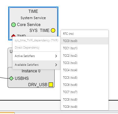 ⑨TIME のTMRダイヤマークを右クリック。出てきたメニューの 「Available Satisfiers」を選択し、更に出てきたメニューから「TCC0」を選択(今回の場合)