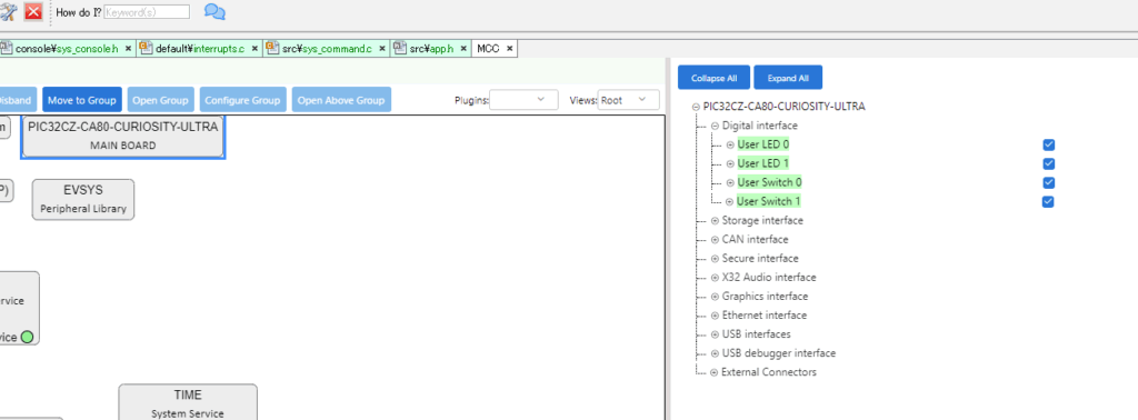 ①「PIC32CZ-CA80-CURIOSITY-ULTRA」ブロックを選択し、右のペインから「PIC32CZ-CA80-CURIOSITY-ULTRA」> 「Digital interface」でUser LED0,1とUser Switch 0,1のチェックを入れます