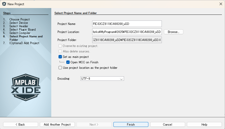 ⑤プロジェクト名、プロジェクト保存先、エンコーディングを選択し「Finish」をクリック。