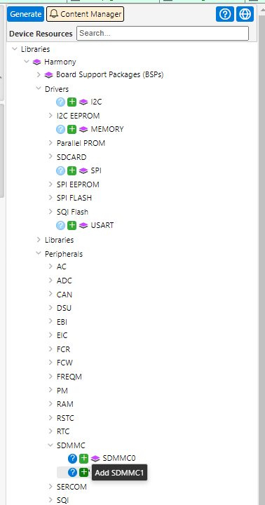 ⑥Libraries > Harmony > USB > Peripherals >SDMMC > SDMMC1を追加