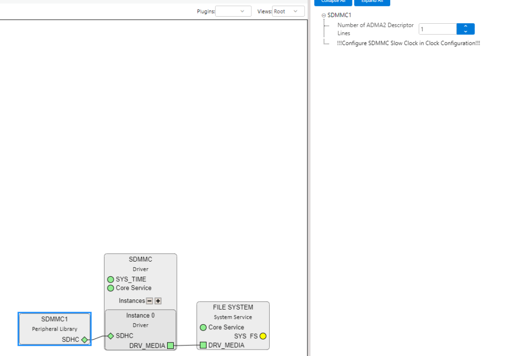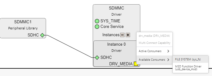 ⑩「SDMMC」の「DRV_MEDIA」四角マークを右クリック。出てきたメニューの 「Available Consumers」を選択し、更に出てきたメニューから「File SYSTEM」を選択すると「File SYSTEM」ブロックが追加される。