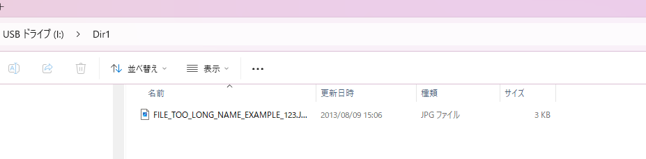 PC側で、μSDカードに「FILE_TOO_LONG_NAME_EXAMPLE_123.JPG」というファイルを保存します。
