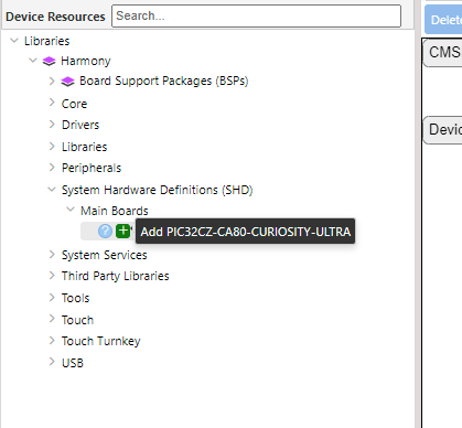 ②Libraries > Harmony > System Hardware Definitions(SHD) > Main Boards > PIC32CZ-CA80-CURIOSITY-ULTRAを追加します